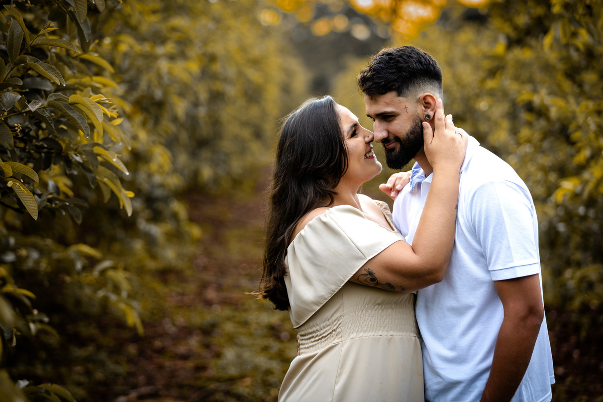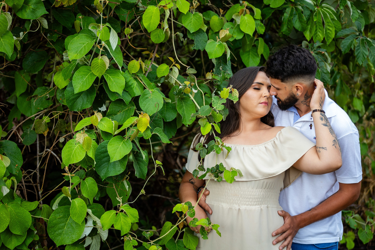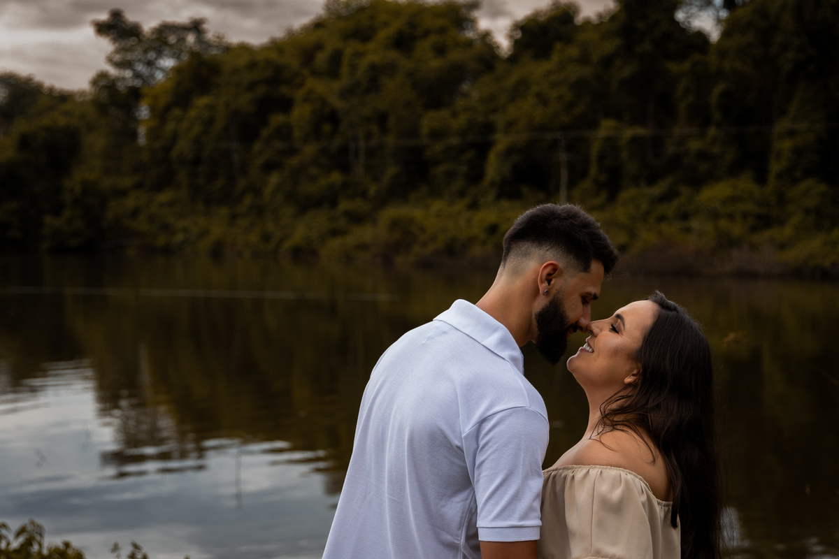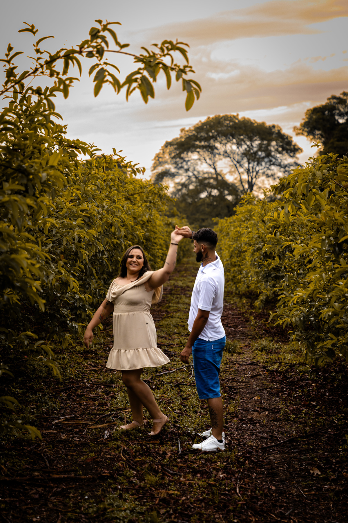 Começamos em uma linda plantação de goiabas, onde o verde vibrante e os gestos espontâneos criaram imagens carregadas de vida e simplicidade. Depois, seguimos para a beira de uma represa serena, onde a chuva fina e o céu nublado deram um charme especial aos registros — como se a natureza também celebrasse o amor dos dois.