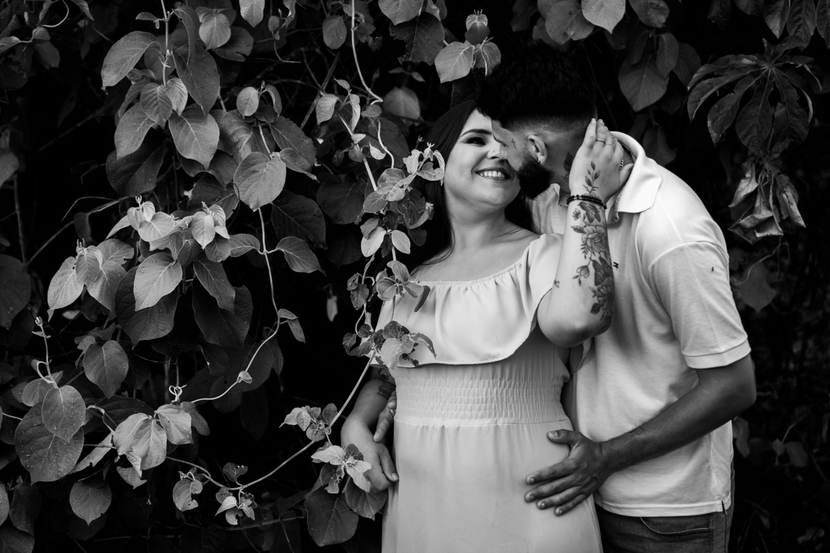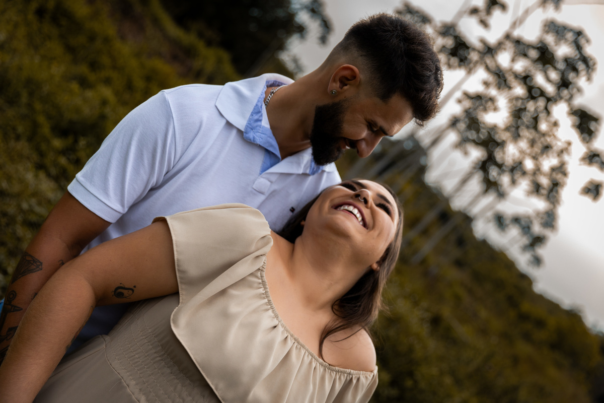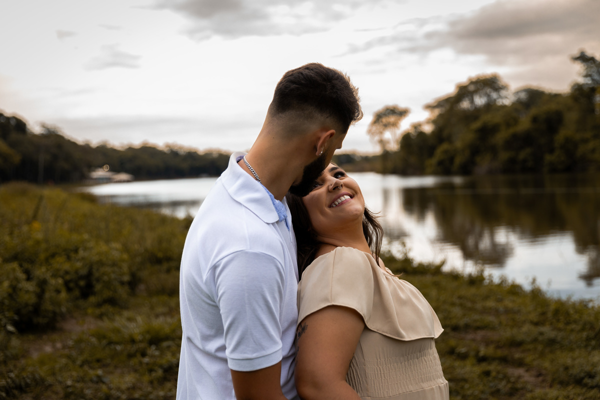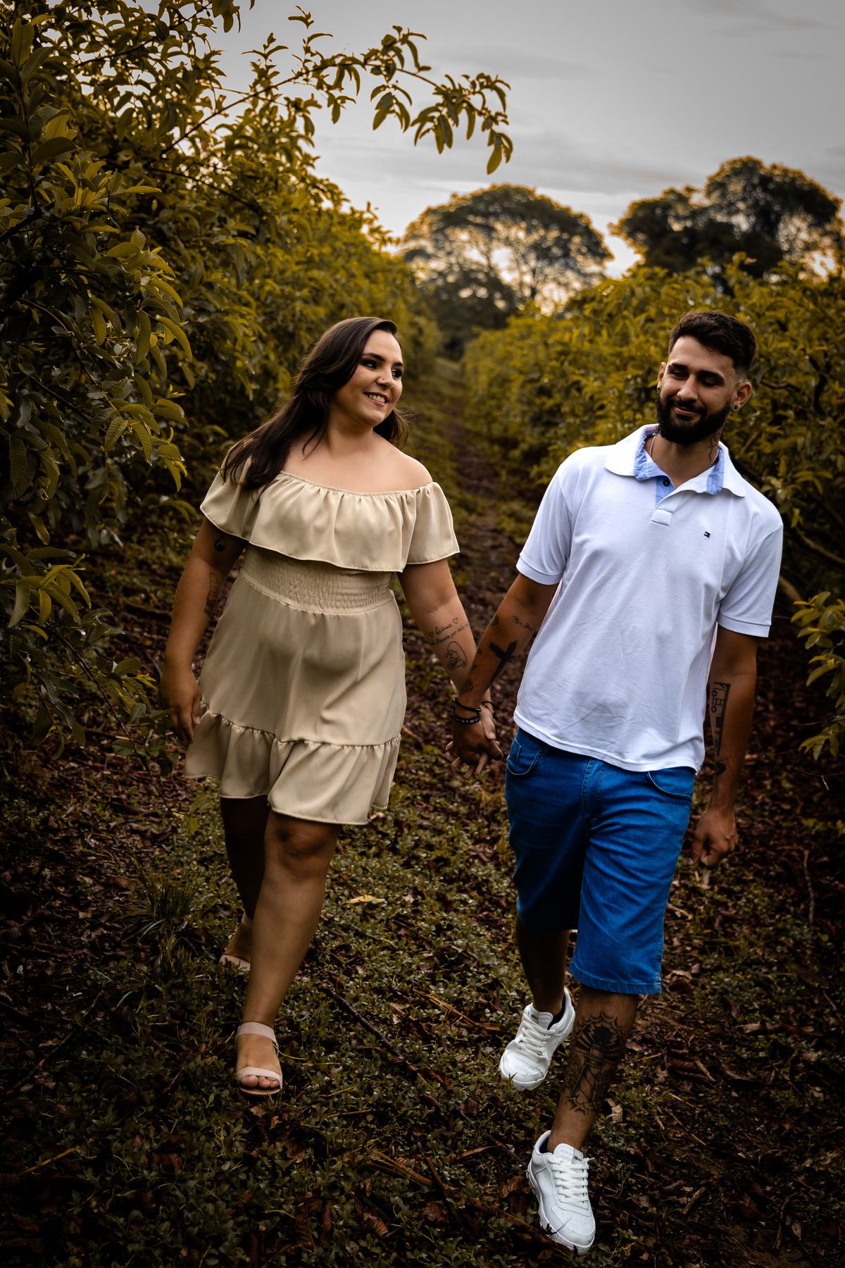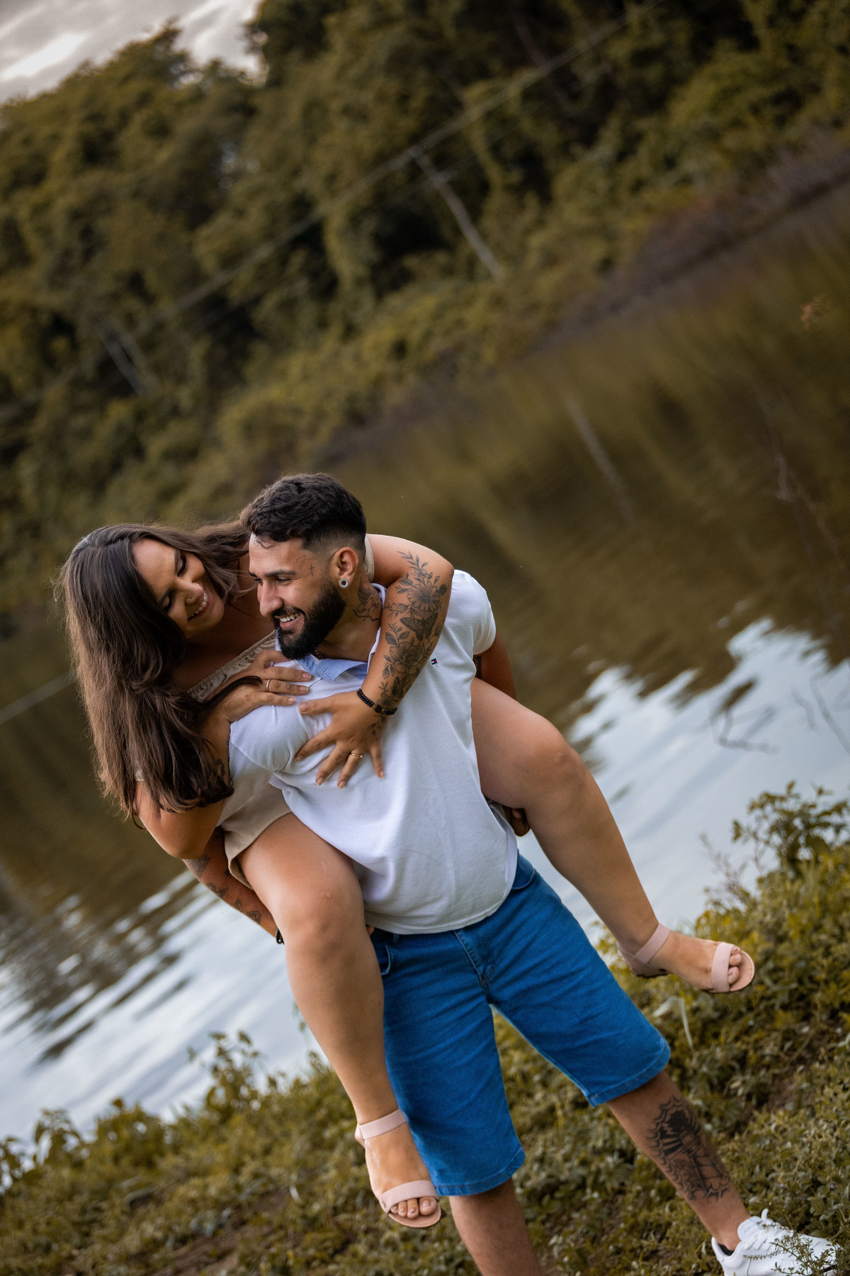 Começamos em uma linda plantação de goiabas, onde o verde vibrante e os gestos espontâneos criaram imagens carregadas de vida e simplicidade. Depois, seguimos para a beira de uma represa serena, onde a chuva fina e o céu nublado deram um charme especial aos registros — como se a natureza também celebrasse o amor dos dois.